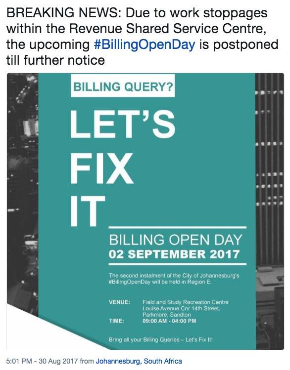 A ‘Let’s Fix It’ Billing Open Day, arranged by the City of Johannesburg, for Region E, had been postponed due to a work stoppage within the Revenue Shared Service Centre.