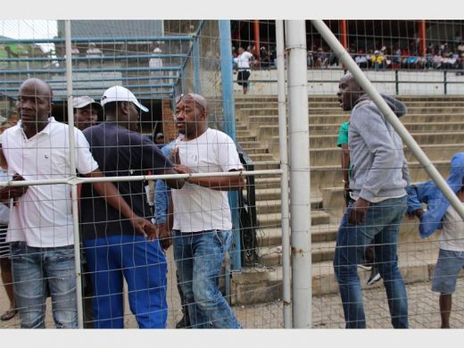 Secretary-general of the association Mafika Morajane in white cap calms down angry supporters outside the gates of the stadium as another tries to open the gate to gain entry. Photo: Sipho Siso