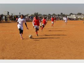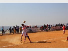 An aerial tussle for the ball between a D-10 player (red) and his Grandiose counterpart in the Map Games last 32. Photo: Zanele Siso/Zanephoto