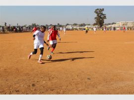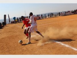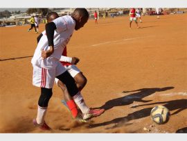 A Grandiose player in a fierce battle for the ball with his D-10 counterpart in the Map Games last 32. Photo: Zanele Siso/Zanephoto