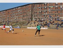 A Grandiose player tries to control the ball in his run for the goals with a D-10 counterpart in the chase. Photo: Zanele Siso/Zanephoto