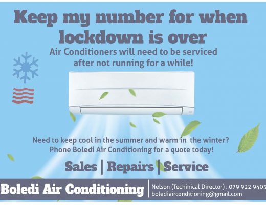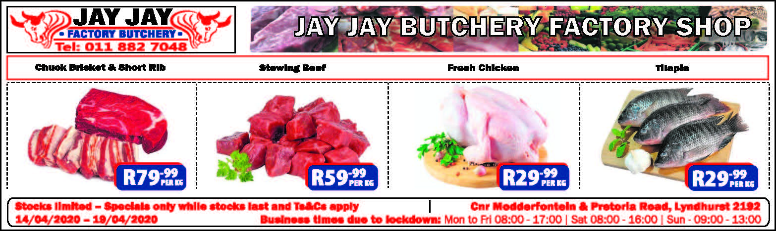 This week, Jay Jay Factory Butchery is offering specials on meat, fish and chicken, while stocks last, and Boledi Air Conditioning is informing readers that they will be open again after the lockdown.