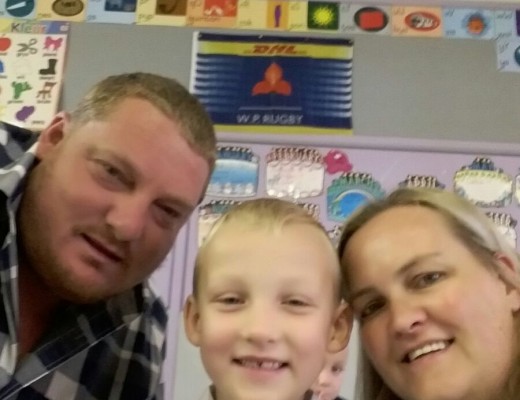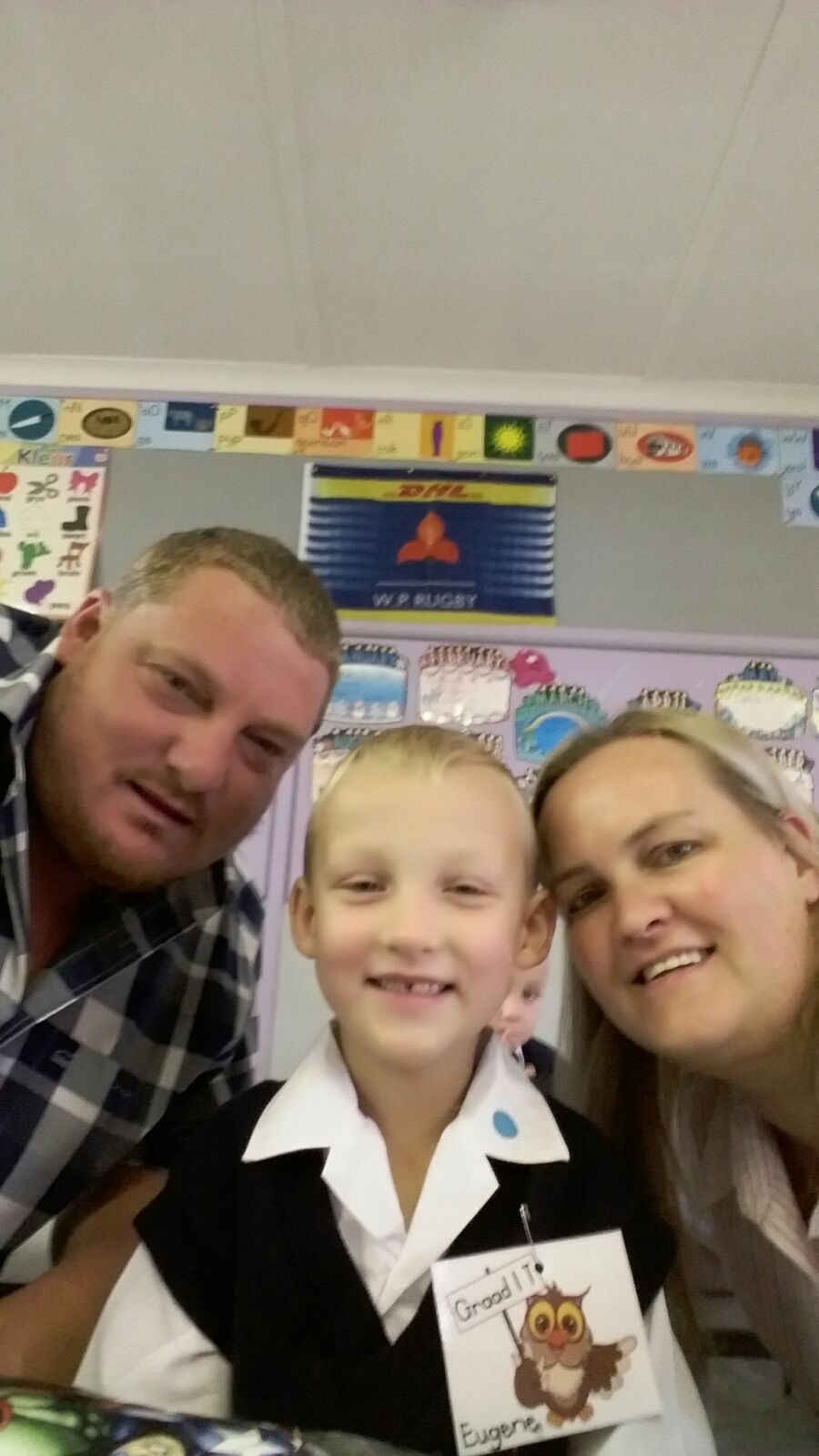 Jannie and Matti Theron with Eugene in Endicott Laerskool Jan van Riebeeck Springs 1st day gr1