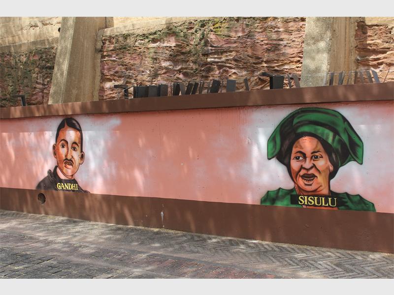 Ghandi, Albertina Sisulu, Lilian Ngoyi, Fatima Meer, Eli Weinberg, Albert Luthuli, Joe Slovo, Robert Sobukwe and Oliver Tambo are just some of the faces painted on these historically significant walls.