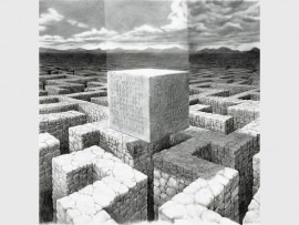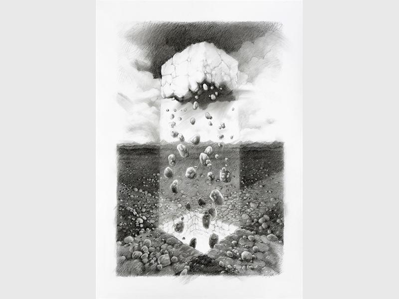 Then, there is Jeppe who is inspired by evidence of historical events that have taken place, either naturally, like the formations of layers of rock, and their eventual erosion, or through human endeavour. His landscapes do not depict known geographical locations, although there is often reference to some form of human intervention. They invariably include events and structures in the form of holes, blocks, scaffolds, walls, dug into, erected upon, or hovering above the landscape.