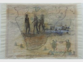 Martin experiments with various media including photography, vintage prints and various surfaces. Working with Nathi Ndladla of the Phumani Paper Mill in a collaboration on the medium, Martin’s current series of work layers oil paint onto translucent handmade paper into which she has embedded vintage maps and, in some cases, plants.